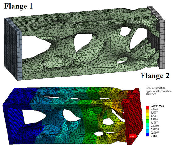- The flange 1 (100 × 100 × 10 mm) is fixed on eight nodes;