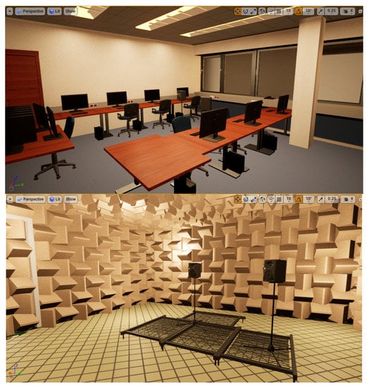 Simulated virtual rooms (top: computer room; bottom: anechoic chamber).