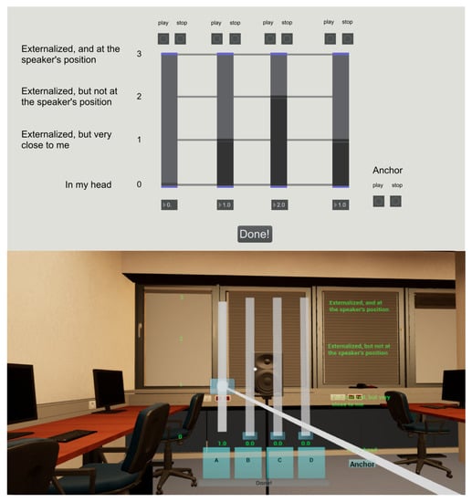 According to this rating scale, a listening experiment was designed for evaluating externalization of test stimuli. In one listening session, three binaurally rendered signals from one source direction ( 0 or 45), and the anchor signal were presented. In Experiment I, the GUI of the listening test was displayed on the laptop screen (implemented in the software Max/MSP), and subjects were asked to rate each stimulus using a slider with a mouse (top panel of Figure 3). In Experiment II, the GUI of the test was shown in the VR display (implemented in the software Unreal Engine), and subjects could rate the test stimuli using the trigger of the Oculus Rift controller (bottom panel of Figure 3). With the consideration of the clarity and conciseness, the descriptions of externalization levels in GUIs have been slightly modified. Subjects were informed about the meaning of the levels in the rating scale.
