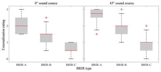Figure 4 shows the externalization results for the desktop-based experiment using box plots. Each panel shows the results for a different source direction (left: 0; right: 45). It can be seen that the externalization ratings of lateral sources are generally higher than those of frontal sources. For each source direction, the results affected significantly by different BRIR types (Friedman test: 0.05). The ratings for the condition “BRIR-C” are significantly lower than for the other two conditions (a series of Wilcoxon tests: 0.04). Overall, subjects rated the externalization higher for the “BRIR-A” condition than for the other two conditions, consistent with the theory of the RDE [7,8,9]. However, only a weak enhancement of externalization is observed for the condition “BRIR-A” compared to the condition “BRIR-B” (Wilcoxon tests: 0.06 for both directions). Nevertheless, this result suggests that matching the room acoustics between the binaural signals and the real listening environment is important for externalization.