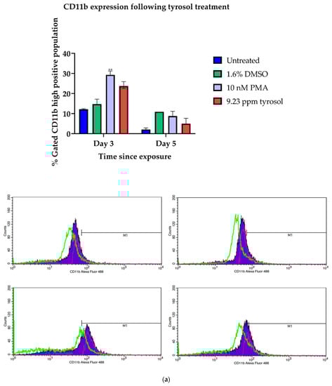 CD11b is an integrin marker expressed by leukocytes during the inflammatory response and is associated with leukocyte adhesion and migration. High CD11b populations were recorded at 23.70% (day 3) for tyrosol and were comparable to the 29.31% (day 3) recorded with the positive control (PMA) associated with the induction of monocyte differentiation (Figure 5a). There was no statistically significant difference between CD11b expression following tyrosol treatment and CD11b expression following PMA treatment.