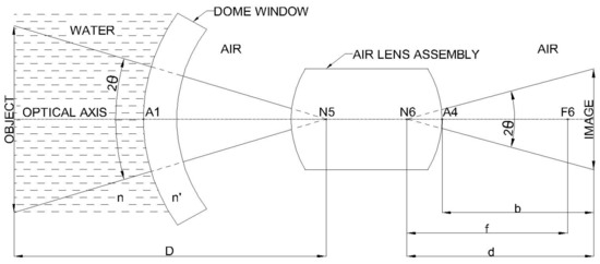 Underwater lenses are composed of a dome window and an air lens assembly, and the two components should be designed together. The initial architecture of the underwater lenses designed in this study was a dome window and a double-Gauss lens, as illustrated in Figure 9. We used quartz glass as the material for the dome window in consideration of water pressure and Schott lenses for the air lens assembly.