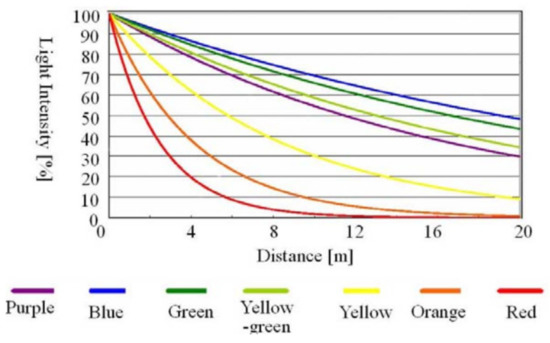 Spectrum of the horizontal axis which is around the water depth from 0 to 20 m, and the vertical axis is light intensity (%). Blue and green lights attenuate the slowest and second slowest in intensity; red light attenuates the fastest. This diagram is from reference [10].
