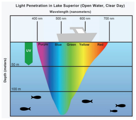 Penetration of light at different wavelengths [11]. In Lake Superior, the penetration depth of red light is less than 50 m, whereas that of blue and green lights exceeds 100 m.