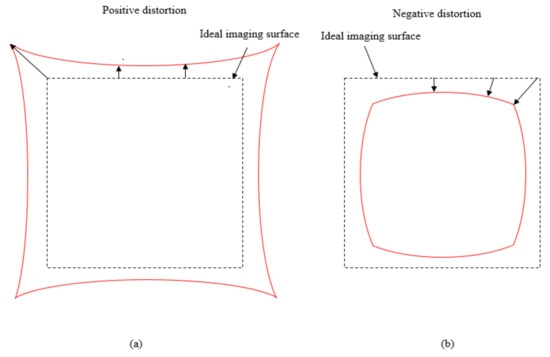 In ideal optics, the magnification of each field of view is identical. However, in reality, after light passes through an optical system and is focused on the imaging surface, the magnification differs at different image heights, and the objects in the images are then deformed, as depicted in Figure 5. This is called distortion. In positive distortion, also called pincushion distortion, the actual imaging surface is larger than the ideal imaging surface. In negative distortion, also called barrel distortion, the actual imaging surface is smaller than the ideal imaging surface.