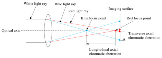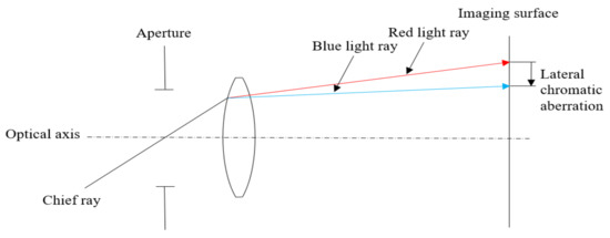 The refractive index of glass varies depending on its material, whereas that of light differs by its wavelength. After entering an optical system, a ray of white light produces light in different color bands when refraction occurs. Chromatic aberration occurs when different colored light is focused at different positions. Chromatic aberration is positive when the focus point of light with long wavelengths is left of that of light with short wavelengths. Conversely, chromatic aberration is negative when the focus point of the light with long wavelengths is right of that of light with short wavelengths. Generally, red light is longer in wavelength and blue light is shorter in wavelength. In addition, chromatic aberration can be categorized into axial and lateral. As depicted in Figure 6, axial chromatic aberration indicates that the difference between the focus points of light at different wavelengths is on the optical axis after refraction in an optical system. As illustrated in Figure 7, lateral chromatic aberration refers to a difference between the focus points of light at different wavelengths on the ideal imaging surface after refraction in an optical system.