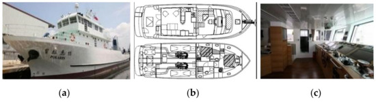 Polaris is the product of an industry–academia partnership between Dragon Prince Hydro-Survey Enterprise Co. Kaohsiung City 800, Taiwan and National Kaohsiung University of Science and Technology (Nanzi Campus), and it is Taiwan’s first nongovernmental oceanographic research and survey vessel. It was built by Shing Sheng Fa Boat Building Co, Ltd. Kaohsiung City 80544, Taiwan. It weighs 260 tons has a top speed of 11 knots, and is 36.98 m long by 6.80 m wide. Since 2008, Polaris has been stationed at the Innovation Incubation Center of National Kaohsiung University of Science and Technology, and it is typically parked at the jetty of the Cijin Campus. Polaris has completed many underwater exploration and rescue operations. For example, various parties were involved in the search for Malaysia Airlines flight MH370, which mysteriously disappeared on 8 March 2014. The Indian Ocean is approximately 3900 m deep on average, and approximately 8000 m deep at its deepest. The search operations required advanced equipment, and Polaris was invited to Australia to use its underwater detection and deep tow system to help in salvation operations. This demonstrated the international recognition of the high-quality system on Polaris. Photographs and diagrams of the vessel are presented in Figure 8a–c.