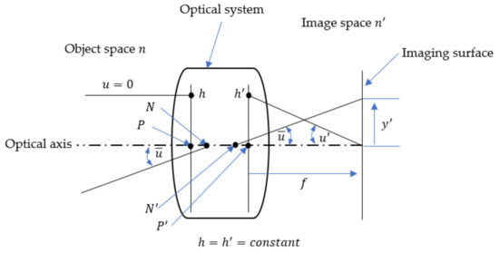 Theoretically, in an optical system where the object is at infinity, the refractive indices of the object space and the image space are different. The refractive index of the object space is , and that of the image space is . The focal length is , and the image height is . The first and second principle points are and respectively; the first and second nodal points are and respectively. The incident and emergent angles of the chief ray are . The included angle between the marginal ray and the optical axis is in the object space and in the image space. The heights of the incident point and emergent point of the marginal ray are and , respectively. By using the optical invariant [12], we could infer the relationship among refractive index, focal length, angle of view, and image height, as expressed in Equation (8) [13].