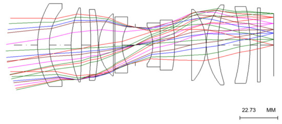 Despite the two concerns of optical aberrations and resolving power, zoom lenses have more degrees of freedom than prime lenses. Therefore, we used the genetic algorithm for optimization and conducted optical design in Zemax as follows: the optimal glass lens sets were initially selected in Zemax based on the genetic algorithm to significantly reduce chromatic aberration, particularly axial chromatic aberrations [18,19]. Various approaches can be used to reduce axial chromatic aberration; however, the most direct and efficient method is to select an appropriate optical glass. Neither the least damping square in Zemax nor CODEV could reduce the chromatic aberration of the zoom lens to a low value [17,20]. However, we incorporated the high-level language of the genetic algorithm into Zemax for optimization and obtained a set of lenses that produced relatively low axial chromatic aberration. We made minute adjustments to the zoom lenses and further identified the displacement of the highest resolving power lenses separately at different depths and under different spectra.