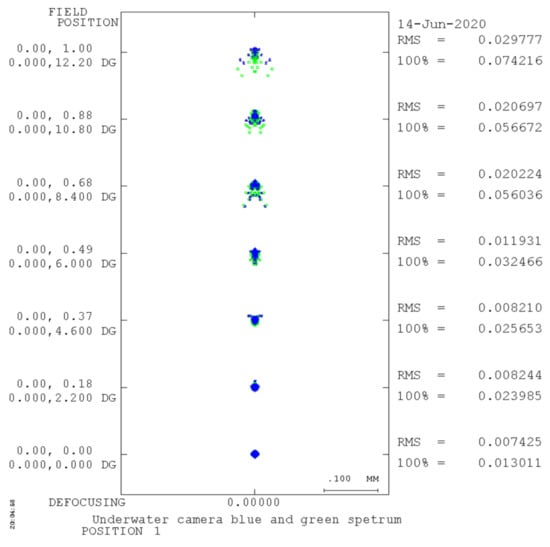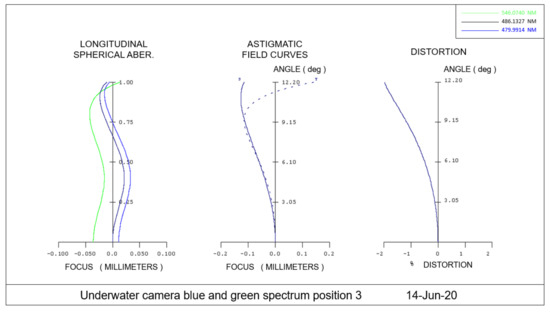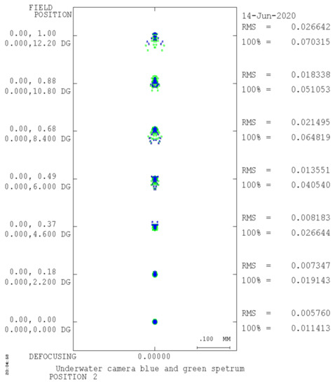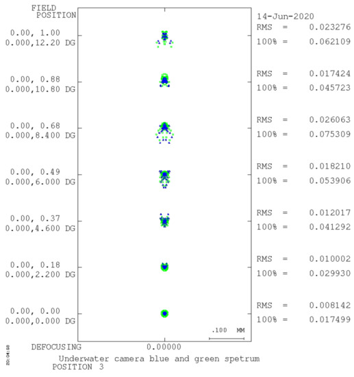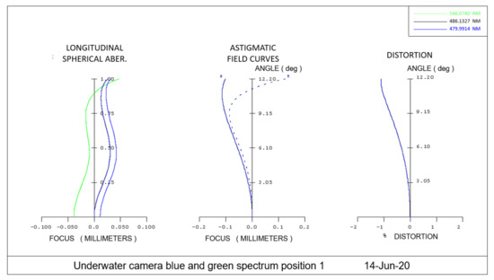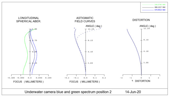 The selected wavelengths from the blue–green spectrum are listed in Table 5. We selected green and blue light wavelengths because they have superior penetration ability in lakes. The weight ratio of the three selected wavelengths was 1:1:1, and the center wavelength was in the blue light range. The lens was designed to reduce the chromatic aberration value, particularly that of green and blue light, to a low point. In CODE V, we mainly used wavelength weights to attenuate chromatic aberration.