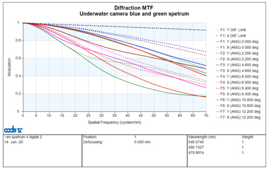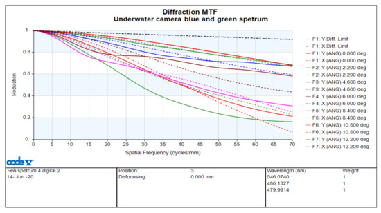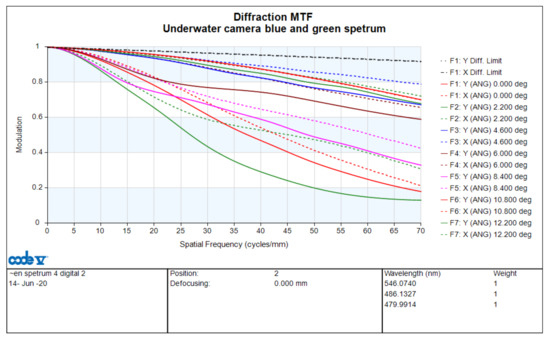 The specifications of the underwater lenses designed for the full and blue–green spectra are listed in Table 3. The actual image height detected by the sensor was 21.6 mm, the pixel size was 7.13 μm, and the spatial frequency was 70 lp/mm. The aperture and focal length were f/2 and 75 mm, respectively, and a half-angle of view of 12.20° was obtained. The half-angles of view and their weight ratios are listed in Table 4. We selected seven fields of view for the design of the prime lens. The weight of the on-axis field of view was the largest, and that of the outermost field of view was the smallest.