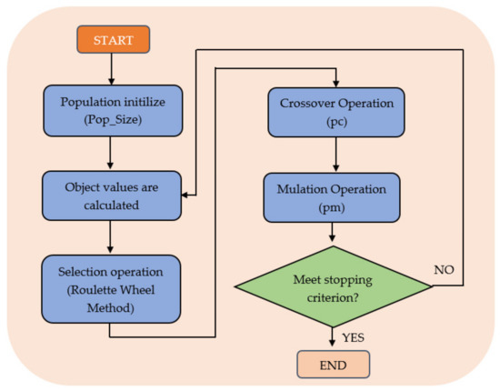 In the preceding selection, crossover, and mutation were the basic calculations of the genetic algorithm. Figure 23 presents the implementation procedure of the GA in this study. This GA is based on pop_size 200, crossover rate 0.8, and mutation rate 0.3 for running 200 generations.