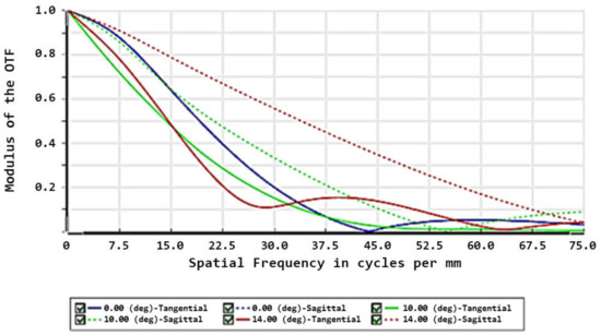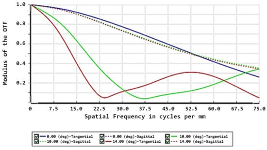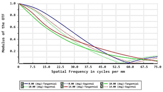 The modulation transfer function (MTF) is another method for inspecting the quality of an optical system. The horizontal axis is the spatial frequency, and the vertical axis is the modulation. The highest spatial frequency was defined as 70 lp/mm; the highest and lowest modulations were 1 and 0, respectively. Figure 17, Figure 18 and Figure 19 are the MTF curves with an infinite, 10-m, and 5-m object distance. The outermost off-axis field of view was preferable with an infinite object distance and superior to the sixth field of view with an object distance of 5 m.