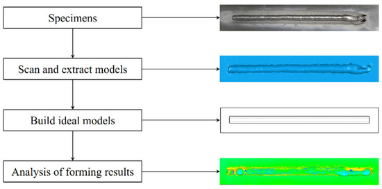 The standard deviation reflects the smoothness of the specimen. It focuses on the surface roughness of the specimen, but it cannot reflect the local shape of the specimen. The root mean square value reflects the deviation between the specimen and the ideal model, and can reflect the degree of deviation of the surface profile from the ideal surface, which can better characterize the surface quality of these specimens. The specific evaluation steps are shown in Figure 2.