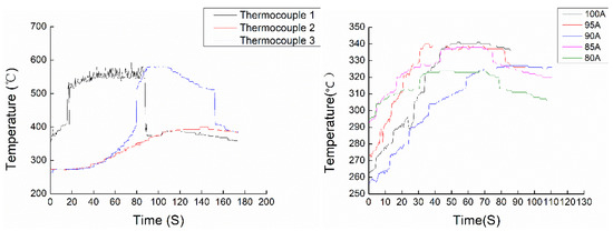 Figure 5 also shows the temperature change trend monitored by thermocouple 2 under different heat inputs. With the decrease of current intensity, the intensity of temperature change gradually decreases. Because the monitoring point is in the middle of the specimen and not close to the arc itself, the temperature changes relatively smoothly. As shown in Figure 5, the temperature of the monitoring point has a more obvious difference. It can be clearly seen that the temperature is proportional to the size of the current. That is to say, the change of the process parameters causes the differences in the heat input of each specimen. When different samples were manufactured by an additive, the length of the samples was the same, and the higher the walking speed, the earlier the maximum temperature monitored by thermocouple 2 should appear. However, a slight difference appeared in Figure 5, indicating that the influence of current and walking speed on heat input had a joint effect.
