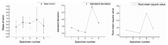 The average value of the error, standard deviation, and root mean square value of each specimen.