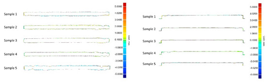 The actual molded specimen was used as the reference model, and the ideal profile model was used as the test model. Figure 6 shows the difference between the actual molded specimen surface and the ideal model surface under different heat input conditions. On the whole, the surface of each specimen has good consistency with the ideal model. However, due to the fact that there are many variables in WAAM, such as heat input, there was a certain difference between the specimen and the ideal model. For example, when the heat input is 11,250 J·mm−1 and 6160 J·mm−1, the surface of the specimen is quite different from the ideal model. When the heat input is moderate, the surface quality of the specimen has been improved to a large extent.