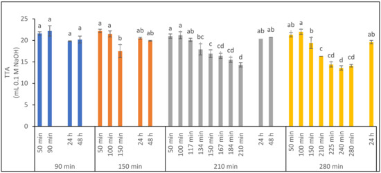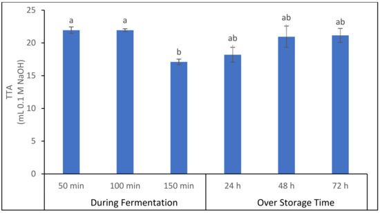 Changes in total titratable acidity of the ferment during fermentation and over a 48 h storage. Bars represent the means and standard deviations of two replication. Bars with different letters indicate significant differences for the results for each fermentation time at p < 0.05 (Tukey–Kramer test). Results for 280 min of fermentation at 48 h of storage are not available.