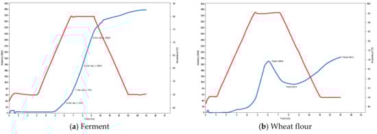 A comparison of the RVA pasting curves of the ferment after 150 min of fermentation with wheat flour is shown in Figure 2a,b, respectively.