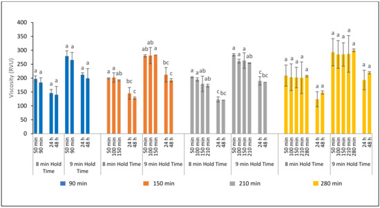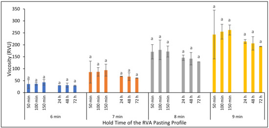 Ferment viscosity at 6–9 min holding time of the pasting profile during fermentation and over a 72 h storage. Bars represent the means and standard deviations of two replications. No significant differences were detected for the results at p < 0.05 (Tukey–Kramer test) for each holding time as indicated with the bars with the same letter.