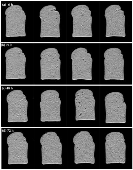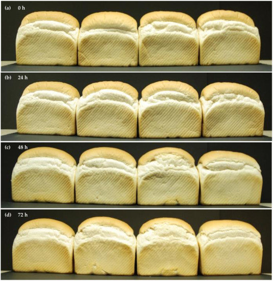 Slices of bread made with fresh ferment and stored over a 72 h period. (a) 0 h of storage, (b) 24 h of storage, (c) 48 h of storage, and (d) 72 h of storage. Left to right: control (no ferment), 30% ferment inclusion, 50% ferment inclusion, and 70% ferment inclusion.