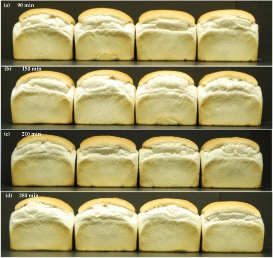 Breads made with fresh ferment and stored over a 72 h period. (a) 0 h of storage, (b) 24 h of storage, (c) 48 h of storage, and (d) 72 h of storage. Left to right: control (no ferment), 30% ferment inclusion, 50% ferment inclusion, and 70% ferment inclusion.
