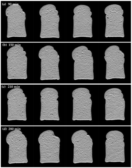 Slices of bread made with ferment prepared using varying fermentation times. (a) 90 min, (b) 150 min, (c) 210 min, and (d) 280 min. Left to right: control (no ferment), 30% ferment inclusion, 50% ferment inclusion, and 70% ferment inclusion.