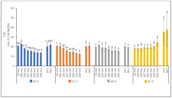 Changes in total titratable acidity of the ferment during fermentation and over a 48 h storage. Bars represent the means and standard deviations of two replication. Bars with different letters indicate significant differences for the results for each fermentation temperature at p < 0.05 (Tukey–Kramer test).