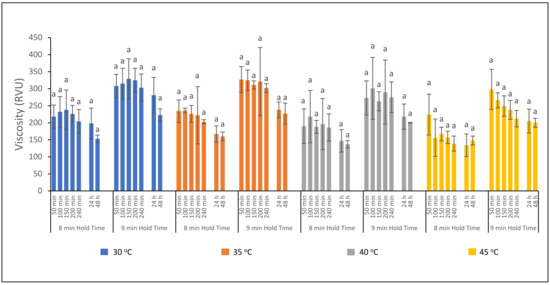 Impact of fermentation temperature on ferment viscosity measured at 8 and 9 min holding time of the pasting profile during fermentation and ferment storage at 24 h and 48 h. Bars represent the means and standard deviations of two replications. No significant differences were detected for the results for each fermentation temperature and hold time at p < 0.05 (Tukey–Kramer test) as indicated with the bars with the same letter.