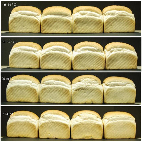 Breads made with ferment prepared using varying fermentation temperatures. (a) 30 °C, (b) 35 °C, (c) 40 °C, and (d) 45 °C. Left to right: control (no ferment), 30% ferment inclusion, 50% ferment inclusion, and 70% ferment inclusion.