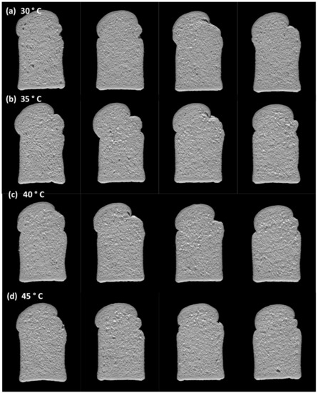 Slices of bread made with ferment prepared using varying fermentation temperatures. (a) 30 °C, (b) 35 °C, (c) 40 °C, and (d) 45 °C. Left to right: control (no ferment), 30% ferment inclusion, 50% ferment inclusion, and 70% ferment inclusion.