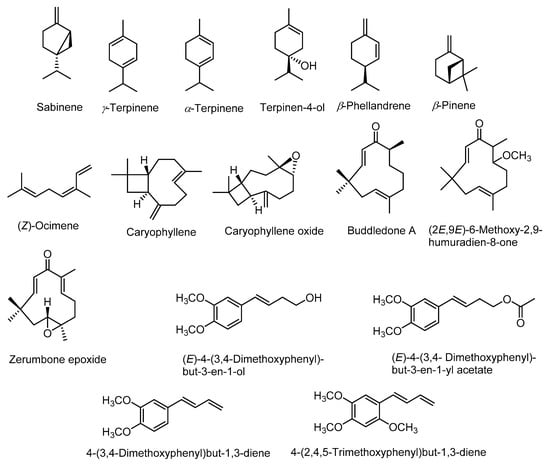 - Bhuiyan, M.N.I.; Chowdhury, J.U.; Begum, J. Volatile constituents of essential oils isolated from leaf and rhizome of Zingiber cassumunar Roxb. Bangladesh J. Pharmacol. 2008, 3, 69–73. [Google Scholar] [CrossRef]