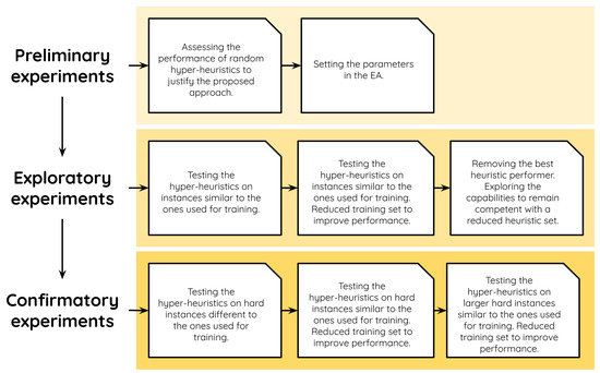 We organized our experiments in three stages: preliminary, exploratory, and confirmatory experiments. For the sake of clarity, these stages are further divided into categories. Figure 2 provides an overview of our experimental methodology. In the following lines, we carefully describe each stage, the corresponding experiments, and the results we obtained.