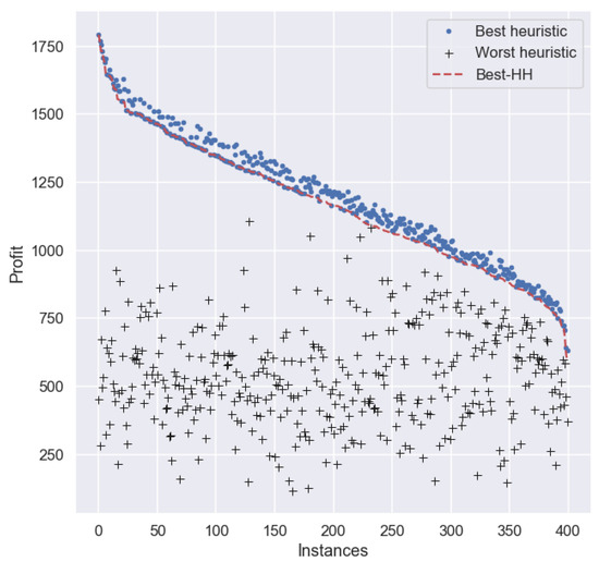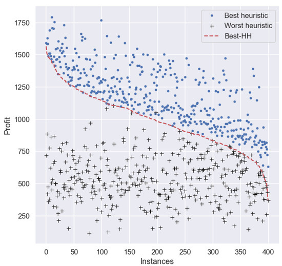 The first experiment conducted in this work aims to prove that we need an intelligent approach to define the sequences of heuristics. In other words, we justify that it is unlikely for a random sequence of heuristics to achieve competent results. For this purpose, we generated 30 random HHs. The length of these HHs was set to 16 heuristics for empirical reasons. As in this experiment, we were only interested in the behavior of randomly generated HHs, the EA was not used to improve the initial HHs. Then, we used the 30 randomly generated HHs to solve set , and we compared their results against the ones obtained by the available heuristics (see Section 3 for more details). For the sake of clarity, our comparisons include the results of three representative HHs from the perspective of total profit on set : the best, the median, and the worst hyper-heuristics.