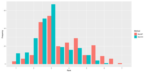 Frequency of the ranks obtained by MaxPW and Best-HH (trained on 60% of set ) the remaining 40% of set .