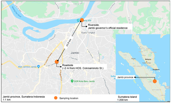 Sampling site at the roadside and riverside in Jambi City, Indonesia.