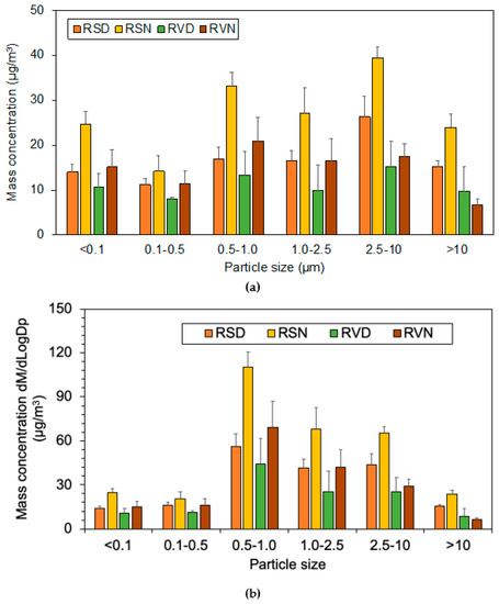Average of mass (a) direct (b) dM/dLogDp concentration of each size PMs in RS and RV at diurnal and nocturnal in Jambi City.