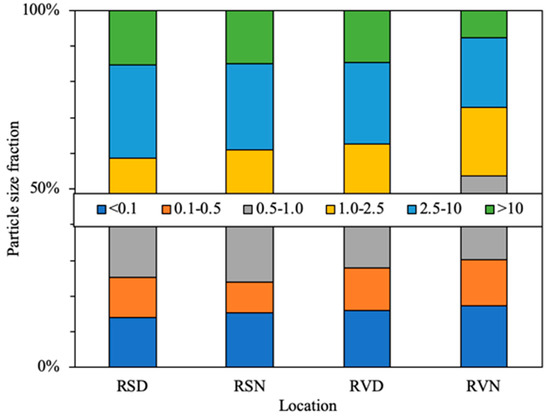 As shown in Figure 2 and Table 1, the PM level at both sites increased in the nocturnal period, except for the >10 μm range in the nocturnal period at the RV site. The nocturnal average TSP concentration at the RS site increased to 162% of the diurnal value. The maximum increase was found in the 0.5–1 μm fraction at 96%. To the contrary, there was a 53% decrease in the average total amount of traffic in the nocturnal period (see Table S2). However, a decrease in HV number was not so significant (~20%). As reported so far [49,50,51], such differences between the diurnal and nocturnal PM levels could also be affected by a change in the thickness of the mixing layer. By assuming that the PM2.5 emission is attributed only to the LV number, an average diurnal/nocturnal ratio of the thickness of a mixing layer can be estimated to be ~4, where the average diurnal/nocturnal ratios of PM2.5 and LV number at the RS site were 0.60 and 2.47, respectively. This is slightly smaller than other reported values [49,52,53]. Since there should be other emission sources, these numbers may be overestimates of the actual value. A moderate increase in the PM fraction of 2.5–10 μm and a slight decrease in the coarse fraction (>10 μm) in the nocturnal period at the RV site may be related to a drastic decrease in the amount of road traffic, e.g., as MC and LV.
