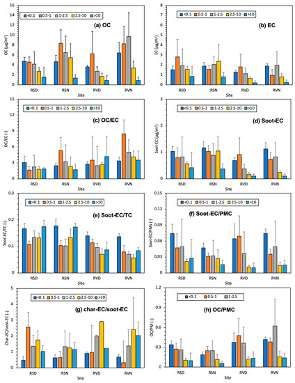 Figure 4a–f shows the average values for the targeted carbonaceous parameters, or, OC, EC, OC/EC, soot-EC, soot-EC/TC and soot-EC/PMC, for each size range, time period and location. The average values for the parameters including those above are summarized in Table 2. For comparison, the values for the average mass ratio of the analyzed carbonaceous components to TC are shown in Figure 5. The EC and soot-EC, parameters which are largely related to HV vehicle emissions, were not as sensitive as the PM concentrations. However, the difference with respect to location was consistent with the expected amount of traffic. The values for these parameters, as well as other HV-related parameters such as soot-EC/TC and soot-EC/PMC, were larger or peaked mostly with respect to the PM0.1 fraction, regardless of the location or the time of collection. This suggests that HV emissions largely account for the PM0.1 fraction at the RS site, where the largest EC3 fraction appeared also at PM0.1 (see Figure 5). Larger EC and soot-EC for fractions >10 μm at the RS site compared to those at the RV site are reasonable, since a larger amount of traffic would be expected. A similar level of soot-EC/TC at the RS site may be partially attributed to tire wear that shares, e.g., 3% of the PM10 [55,56,57,58,59].