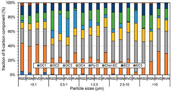 Similar to findings reported in previous studies, the concentration of OC tends to peak at the 0.5–1 μm or 1–2.5 μm fraction except for the diurnal period at the RS site [2,3]. This is also clear for the OC/EC ratio, except for the RS site. As seen from Figure 5, such behavior can largely be attributed to larger fractions of pyOC and char-EC at both the RS and RV sites. Since these values and related parameters are generally accepted as indices of biomass burning, carbonaceous characteristics in the size range of 0.5–1 or 1–2.5 μm, they can be attributed to biomass burning or related emission sources [3,4]. The concentration of OC and OC/EC for the 0.5–1 and 1–2.5 μm fractions increased in the nocturnal period, where the OC/EC ratio was larger at the RV site, while EC and soot-EC were smaller, especially in the case of the >2.5 μm range. Such tendencies in the OC and related parameters may be explained by a larger amount of local biomass burning near the RV site. The larger average char-EC/soot-EC ratio for the 1–2.5 μm range at the RV site may also explain this.