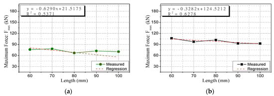 The compressive stiffness decreased as the length of the specimen increased (see Figure 11). In other words, the change in the length of the specimen can be regarded as a change in the compressive stiffness of the specimen. Therefore, the relationships between the compressive stiffness and the maximum force were almost similar between the length and the maximum force. Because the cross-sectional area was constant, as the length increased in steps of 10 mm (from 60 mm to 100 mm) each, the compressive stiffness decreased in inverse proportion and the two variables had a negative linear relationship.