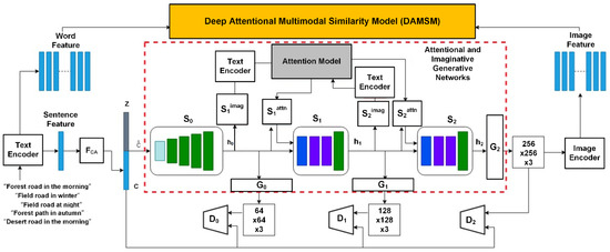In Figure 1, the text encoder is a bidirectional LSTM [33], which extracts the global sentence vectors from the input text descriptions. is the conditioning augmentation [29] that converts the sentence vector to the conditioning vector c. The vector z is a noise vector sampled from a normal distribution. is the upsampling network at each stage. All stages include attention models and imagination models , except for . Note that , and are all modeled as neural networks. The relationship of hidden layers and the upsampling networks can be expressed as Equations (1) and (2).