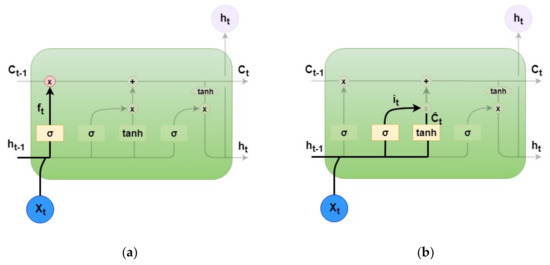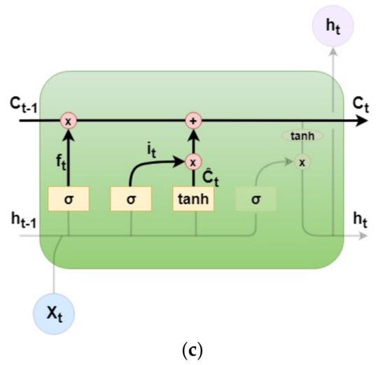 LSTM Cells. (a) Forget Gate, (b) Input Gate, (c) Updating Cell State.
