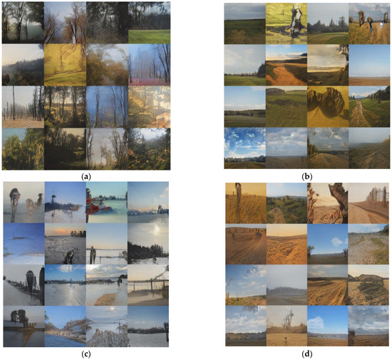 Images Generated by Different Description Combinations Using the Proposed Method. (a) “forest in the morning”, (b) “hayfield in autumn morning”, (c) “beach in winter morning”, (d) “sand in autumn”.