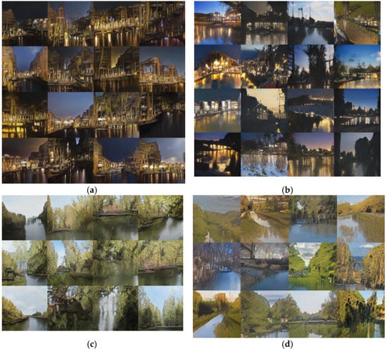 Figure 6 compares some images generated by the proposed method and AttnGAN. We use the same description to generate 12 images at a time using both methods to observe the differences. Figure 6a,b shows images generated under the description “canal at night.” Figure 6c,d displays images generated under the description “canal in autumn.” Images in Figure 6a,c are generated by AttnGAN. Additionally, images in Figure 6b,d are generated by the proposed method. We can see that similar images appear repeatedly in Figure 6a,c, and the images in Figure 6b,d exhibit higher diversity. From Figure 6a, we can see that the results have similar colors. Additionally, the buildings along the canal are very much alike. We can observe that the images in Figure 6b contain different types of buildings, terrains, and reflection patterns. It is clear that the proposed imagination model is able to generate images with larger variety. Although the generated image in the top right corner of Figure 6b is an unsuccessful case, such failed examples also happen in Figure 6c (image on row 3, column 2 and column 3) generated by AttnGAN. Both methods inevitably generate unsatisfying results occasionally.