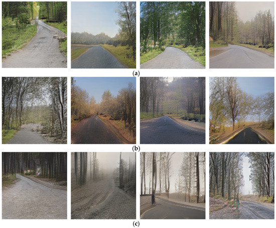 Different Types of Road Images Generated by the Proposed Method. (a) “forest road in the morning”, (b) “forest road in autumn”, (c) “forest road in winter”.