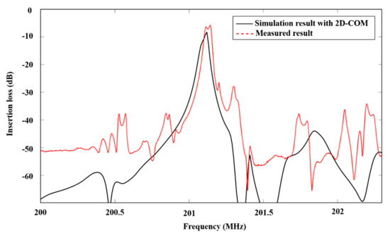 Figure 6. The measured and calculated center frequencies were 201.13 MHz and 201.11 MHz, respectively. The measured result was in good agreement with the simulation.