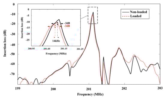 More specifically, under the effect of mass loading, the insertion loss increased around 2 dB, and the center frequency shifted around 14 kHz in the simulation result. On the other hand, the insertion loss increased by 2 dB, and the center frequency shifted around 10 kHz in the measured result. The differences between simulation and experimental results were caused by multiple factors, such as the thickness error of SiO2 load, the fabrication error of SAW chip and the solution accuracy of the 2-D COM theory.