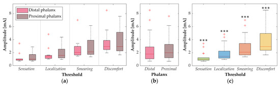 The boxplots of the four thresholds for the distal and proximal phalange are presented in Figure 2a, while the overall average current amplitudes per phalange and per threshold (main effects) are shown in Figure 2b,c, respectively.