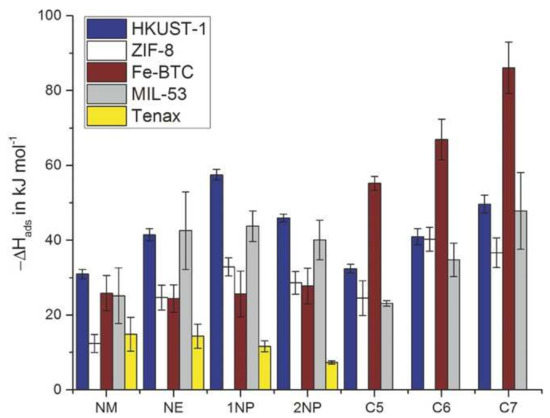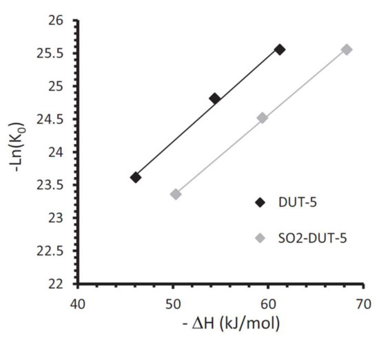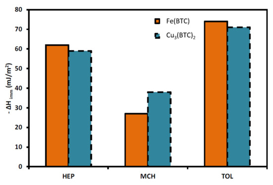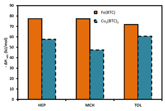 - Gutiérrez, I.; Díaz, E.; Vega, A.; Ordóñez, S.; Guerrero-Ruiz, A.; Castillejos-López, E.; Rodríguez-Ramos, I. Hydrocarbons adsorption on metal trimesate MOFs: Inverse gas chromatography and immersion calorimetry studies. Thermochim. Acta 2015, 602, 36–42. [Google Scholar] [CrossRef]
